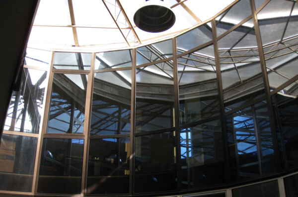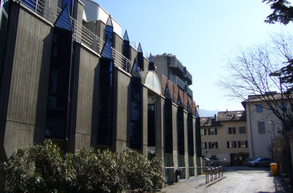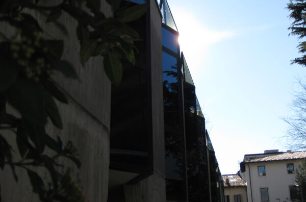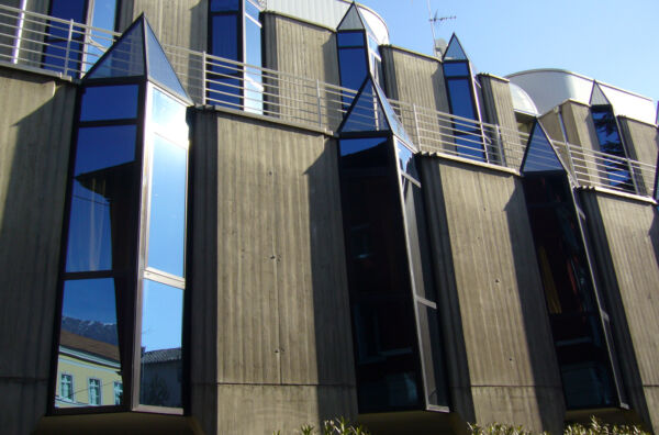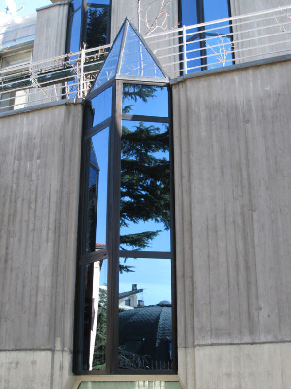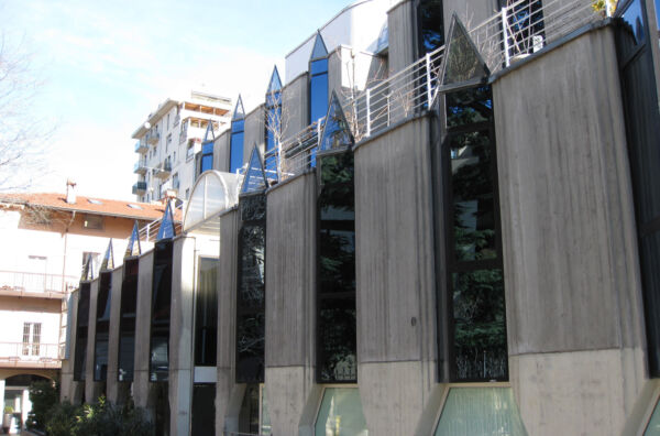 Guglie di vetro e pareti in cemento a vista si inseguono creando una facciata sobria ed elegante.