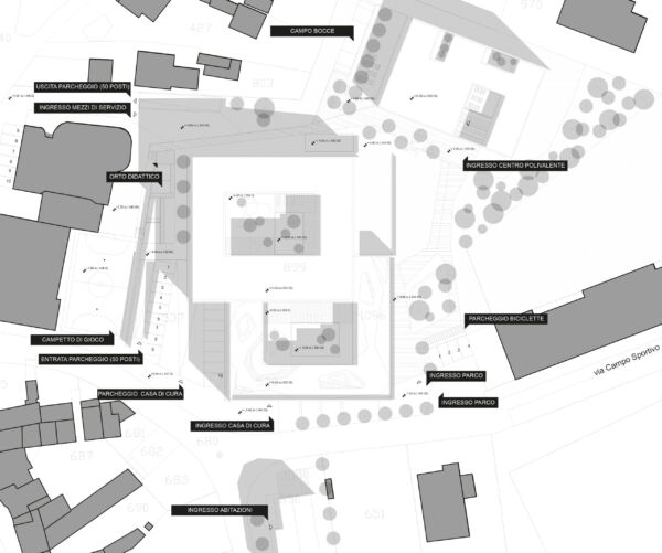 The fulcrum of the entire project is certainly the nursing home, both in terms of size and functional importance. Precisely for this reason, we tried to design a building that has its own strength within the context but is not too bulky. We therefore worked on different levels, including loggias, terraces, routes and courtyards, which would not only lighten the perception of the building but also improve the liveability of the spaces and increase the permeability and therefore the interaction between