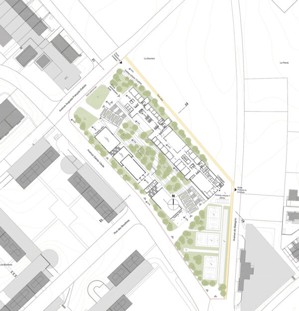 The project covers an area of 3 hectares with the aim of inserting, in a currently green area, a complex of buildings linked to education and culture capable of becoming a pole of integration to be experienced by the community of Meyrin at any time of day. Starting in the morning with the school and related activities, continuing in the afternoon with the library and gymnasium activities and ending in the evening with the theatre and restaurant.