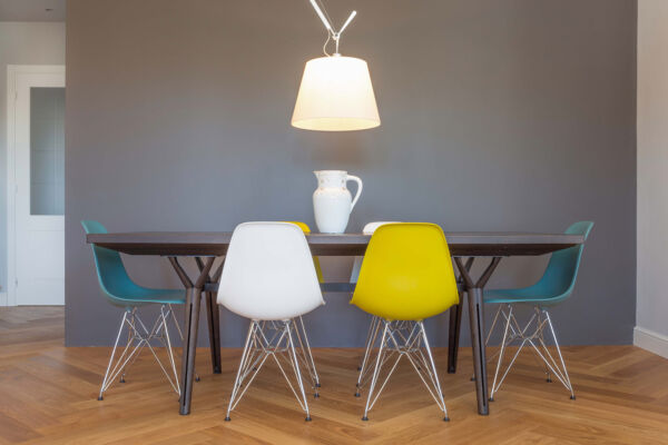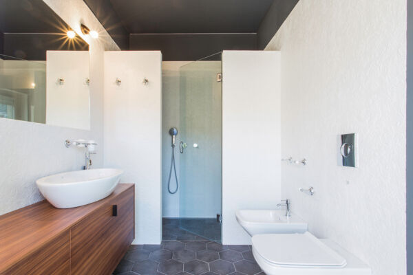 This penthouse, of about 160 square metres, is located in the city centre of Bergamo and has been completely renovated and transformed. From an aesthetic point of view, we opted for a contemporary mood, enriched by some classic choices and specific details, such as the windows and some inlaid profiles. The layout consists of two distinct functional areas, the living area, composed of a generous kitchen and double living room, and the sleeping area, with three bedrooms and two bathrooms. The finishes we have chosen are a honey-coloured Italian herringbone parquet, the walls are coloured in pastel shades to give a unique personality to some of the rooms, while some areas have been enriched with distinctive ceramics to give a touch of originality to the environment.