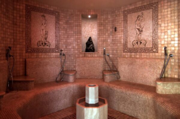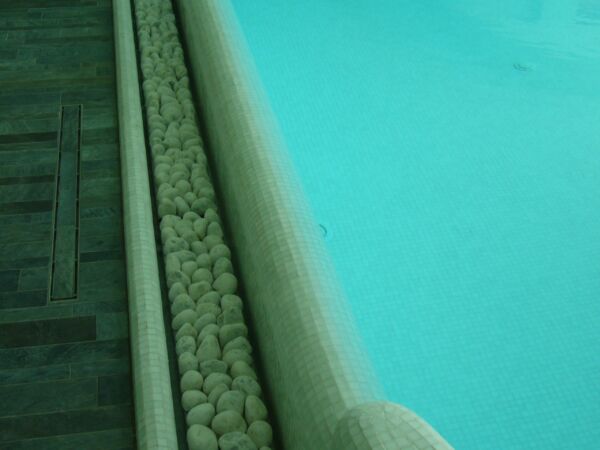 La piscina interna è stata progettata in ogni dettaglio per permettere al rivestimento in mosaico Bisazza color perla di enfatizzare ogni sinuosità. Luci e colori sono studiati per creare un ambiente confortevole e rilassante.