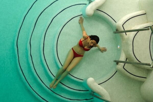 The indoor swimming pool has been designed in every detail to allow the pearl-coloured Bisazza mosaic cladding to emphasise every sinuosity. Lights and colours are designed to create a comfortable and relaxing environment.